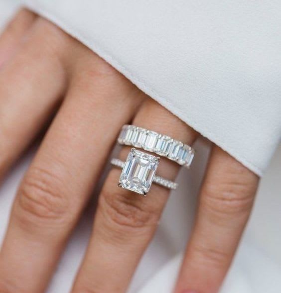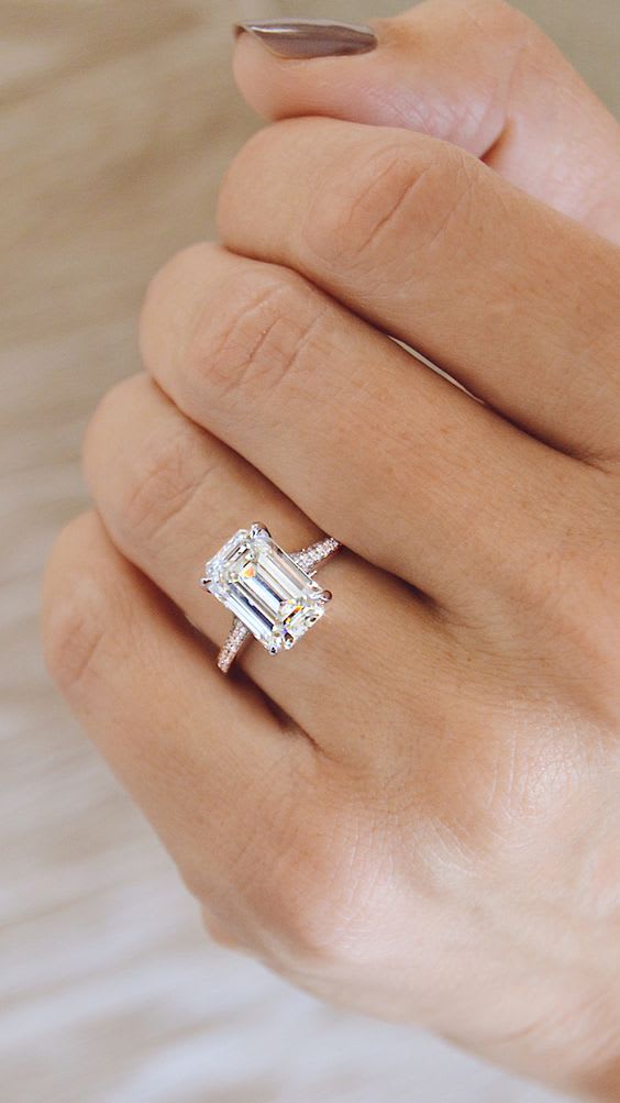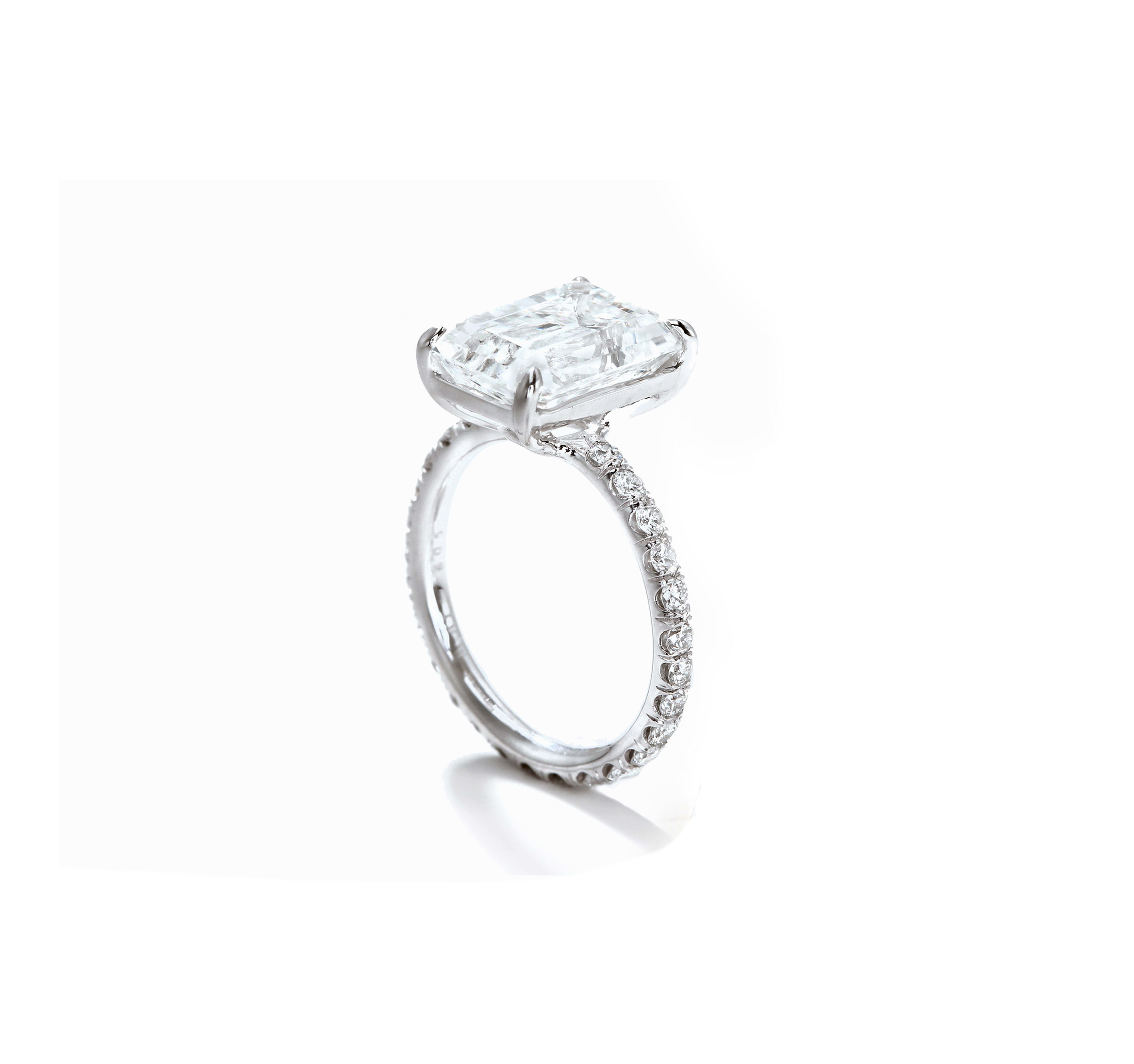 The timeless and elegance of the emerald cut diamond highlights a diamond’s natural brilliance and sparkle. Emerald cut diamond mounted in 18k white gold on a pavé brilliant-cut diamond band. Diamonds are available in a variety of different cuts, carat weights, colour and clarity. Handcrafted and polished in London.