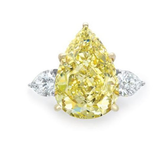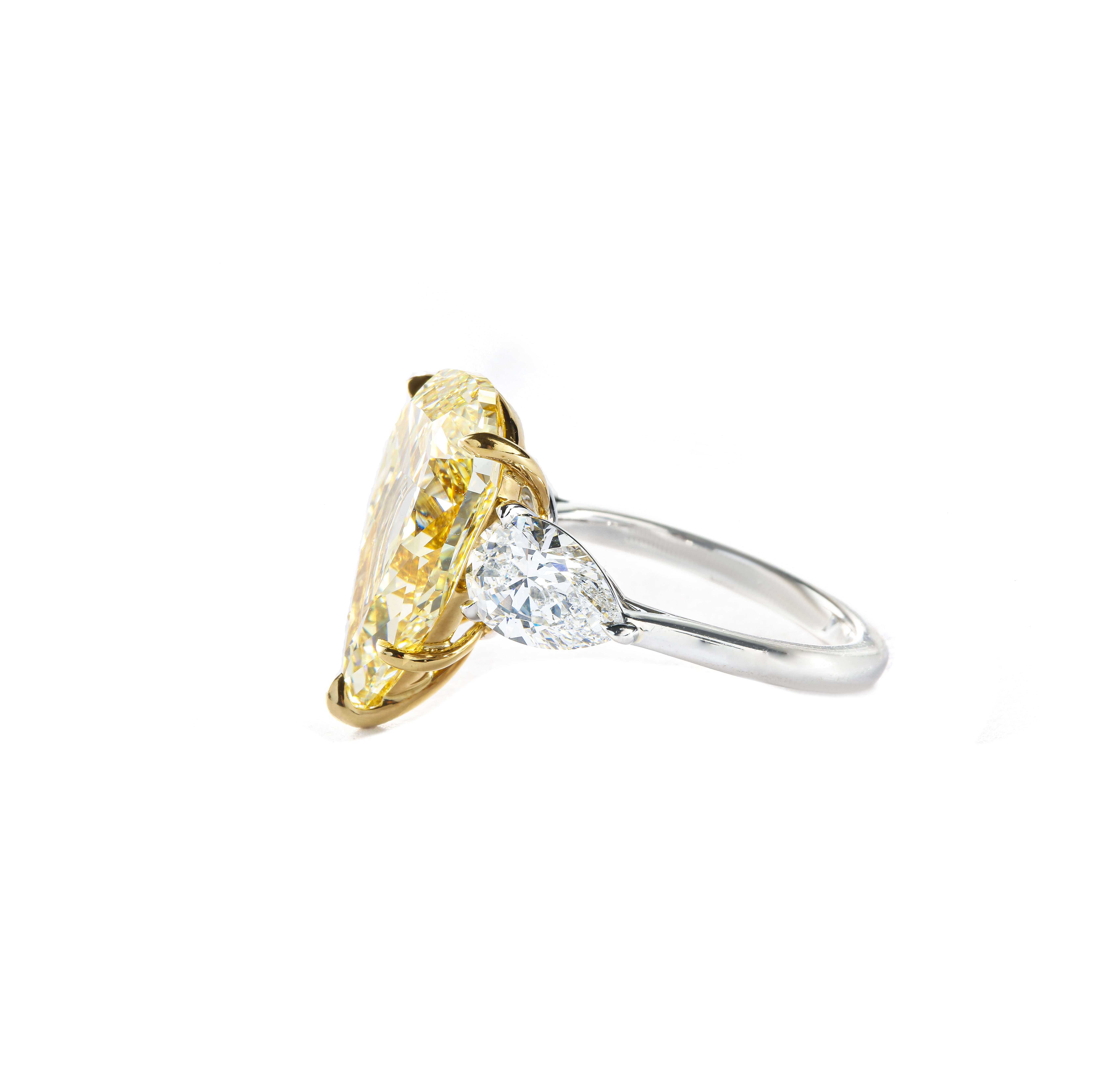 Fancy yellow pear-shaped diamond mounted in 18k white gold with additional pear cut diamonds on the side. The timeless beauty and lifetime brilliance of the Fancy Vivid diamond brings attention to the centre stone and its unique rarity. Available in a variety of colours from Fancy Light to Intense Vivid.