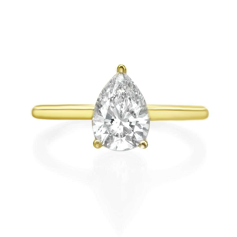 The classic shape of a pear-shaped diamond gently mounted in 18k yellow gold. The natural excellence of the centre diamond highlights its unique brilliance and makes a perfect match to any wedding band. The selection of diamond available from D to H colour along with clarity from Flawless to VS2.