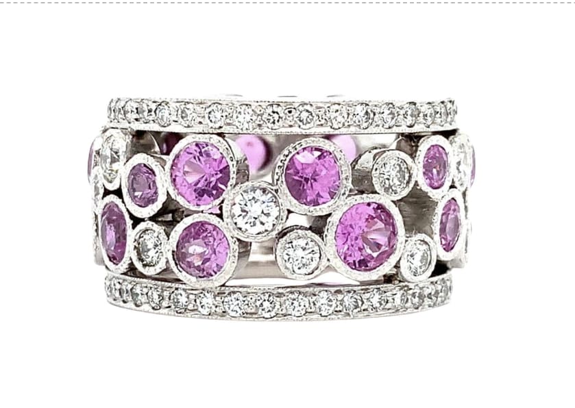 Gorgeous bespoke pink sapphire and round diamond wide engagement ring or wedding band in 18k white gold. Pink sapphire natural gemstone round shaped total weight 2.50ct. Round brilliant diamond F colour VS1 clarity total weight 1.60ct. Width of the ring12.3mm. The ring is perfect for engagement and comes with a valuation certification. The brand, made in London, Pink Sapphire and Diamond Ring, is well-known for its high-quality jewellery. This ring is a true work of art and will make a stunning addition to any collection.